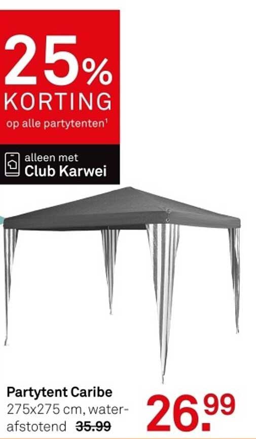 Ben je op zoek naar de perfecte manier om je buitenfeesten te beschermen tegen de elementen? Zoek niet verder! Deze aanbieding voor de Party tent Caribe biedt niet alleen bescherming, maar ook stijl. Met een grootte van 275x275 cm is het de ideale oplossing voor een barbecue, tuinfeest of een gezellig samenzijn met vrienden en familie. En met 25% korting, enkel voor leden van Club Karwei, wordt genieten nog voordeliger!