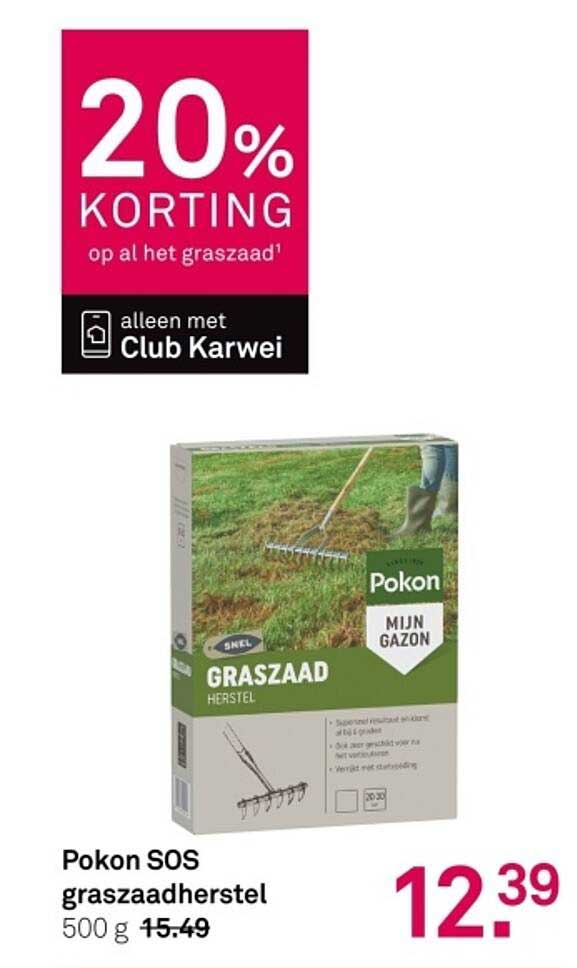 Bekijk de Pokon Sos Graszaadherstel aanbieding bij Karwei! Deze fantastische aanbieding is nu beschikbaar in de nieuwste Karwei folder. Profiteer van deze kans en bespaar flink op je aankoop.