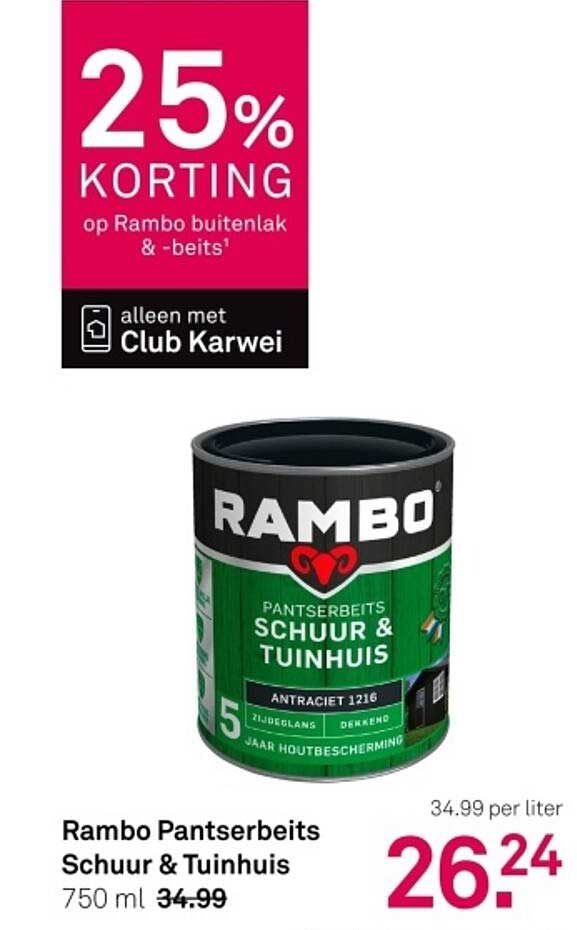 Bekijk de Rambo Pantserbeits Schuur & Tuinhuis aanbieding bij Karwei! Deze fantastische aanbieding is nu beschikbaar in de nieuwste Karwei folder. Profiteer van deze kans en bespaar flink op je aankoop.