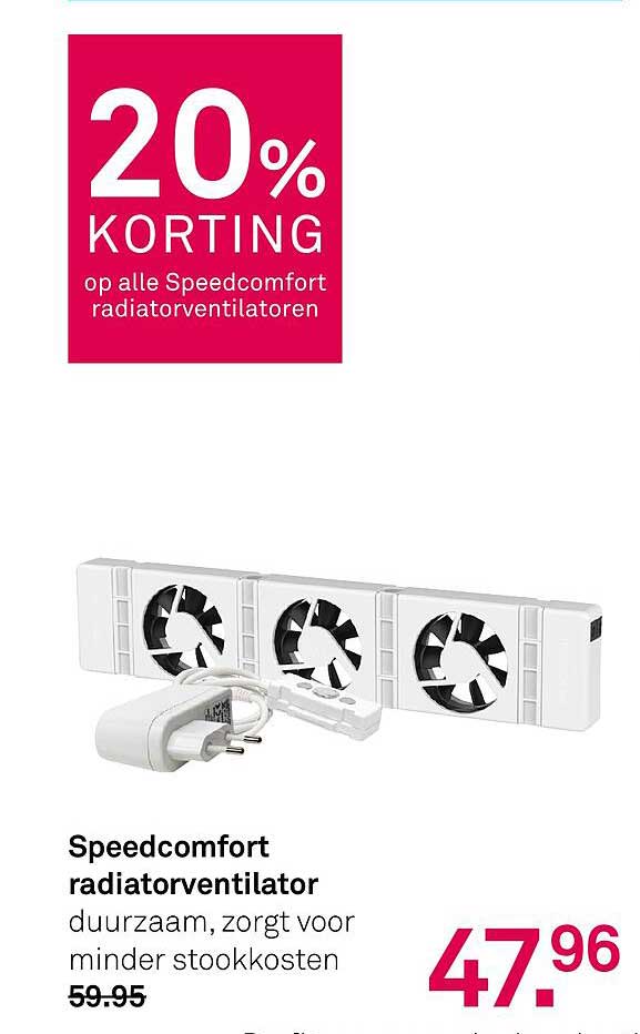 Ben je op zoek naar een slimme manier om je stookkosten te verlagen? Dan is deze aanbieding echt iets voor jou! Met 20% korting op alle Speedcomfort radiatorventilatoren, krijg je niet alleen een uitstekende prijs, maar ook een product dat bijdraagt aan je comfort en energiebesparing.