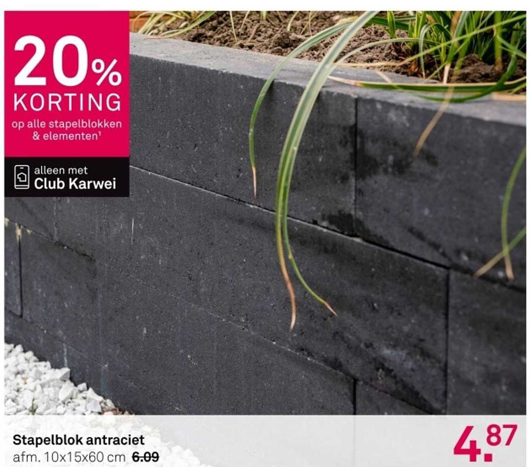 Bekijk de Stapelblok Antraciet aanbieding bij Karwei! Deze fantastische aanbieding is nu beschikbaar in de nieuwste Karwei folder. Profiteer van deze kans en bespaar flink op je aankoop.
