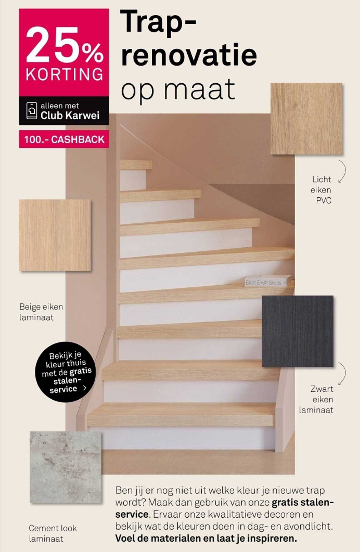 Bekijk nu de Trap-renovatie op maat aanbieding in de Karwei folder. Deze aanbieding is geldig van 18-08-2025 tot en met 24-08-2025.