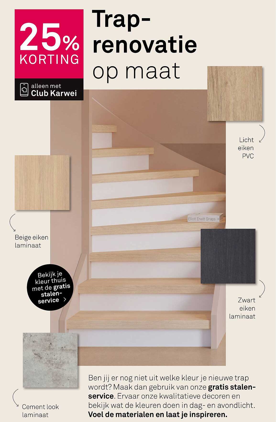 Wil je meer weten over deze aanbieding? Kijk dan sneller even hier voor de volledige Karwei-folder. Hier vind je naast de trap-renovatie ook tal van andere aantrekkelijke aanbiedingen die je niet wilt missen.