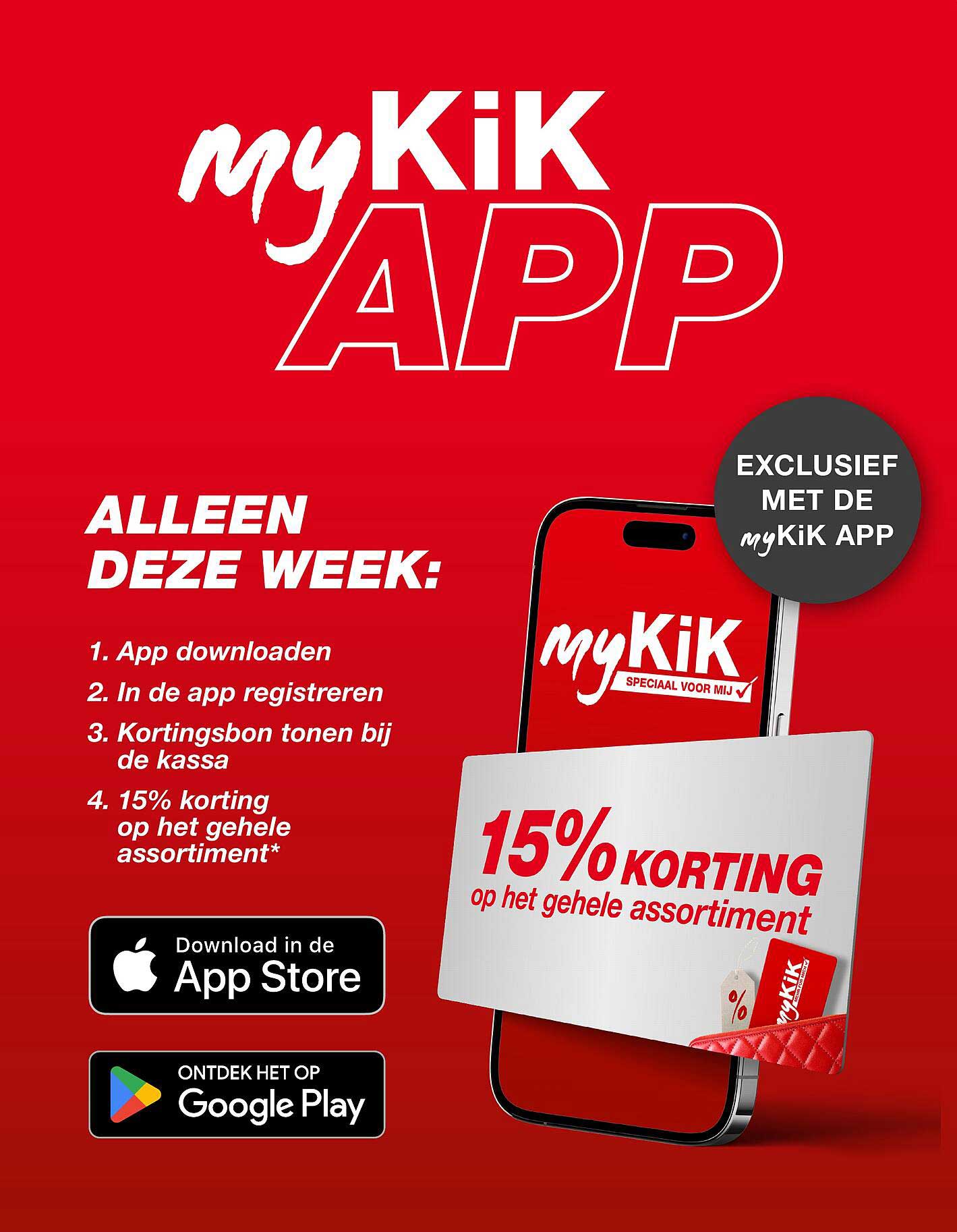 Deze week heb je de kans om uit de ruime collectie van KiK te profiteren met een exclusieve aanbieding. Door gebruik te maken van de myKiK app, ontvang je maar liefst 15% korting op het gehele assortiment! Dit is dé kans om je favoriete items te scoren voor een nóg gunstigere prijs. Laden, registreren en besparen was nog nooit zo eenvoudig!