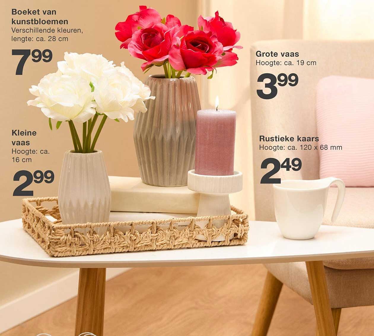 Bekijk de Boeket Van Kunstbloemen Kleine Vaas Grote Vaas Rustieke Kaars aanbieding bij KiK! Deze fantastische aanbieding is nu beschikbaar in de nieuwste KiK folder. Profiteer van deze kans en bespaar flink op je aankoop.
