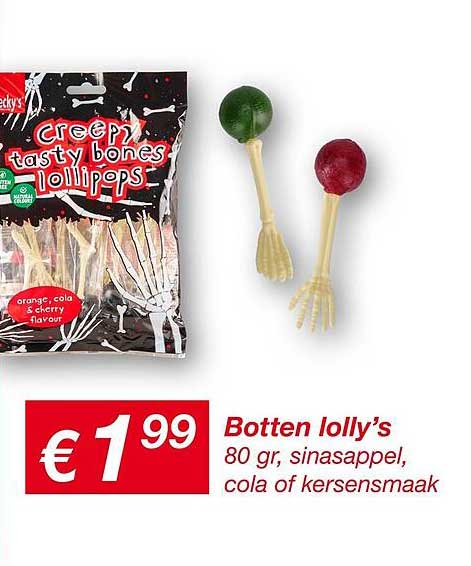 Maak kennis met een uitzonderlijk leuke treat: de Botten lolly's van KiK! Deze opvallende snoepjes zijn perfect voor zowel jong als oud en brengen een glimlach op je gezicht. Perfect voor Halloween of gewoon als een gezellige snack voor elk moment. Met hun unieke uiterlijk en heerlijke smaken zorgen ze voor een echte traktatie!