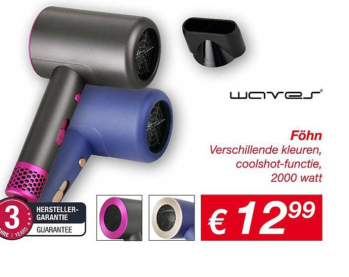 Ben je op zoek naar een krachtige föhn die je haar in een handomdraai droogt en stijlvol in model brengt? Kijk dan niet verder! Deze föhn van Waves is niet alleen functioneel, maar ook beschikbaar in verschillende trendy kleuren. Met een vermogen van 2000 watt zorgt deze föhn ervoor dat je tijd bespaart tijdens je dagelijkse haarroutine. Bovendien beschikt hij over een coolshot-functie, perfect voor het fixeren van je kapsel.