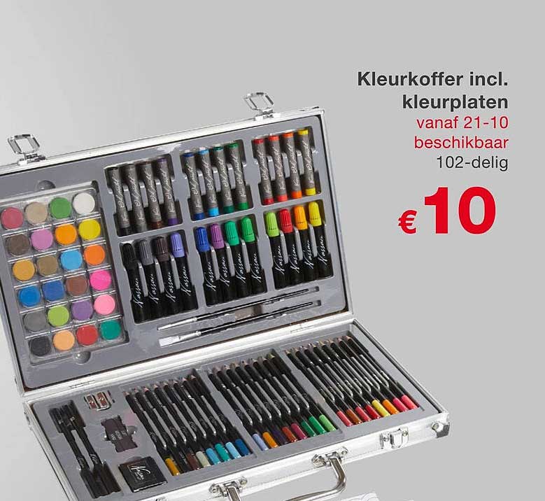 Bekijk de Kleurkoffer Incl. Kleurplaten aanbieding bij KiK! Deze fantastische aanbieding is nu beschikbaar in de nieuwste KiK folder. Profiteer van deze kans en bespaar flink op je aankoop.