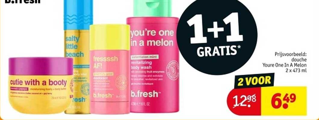 Ken je het gevoel van frisheid en verfrissing tijdens je dagelijkse verzorgingsroutine? Met de geweldige aanbieding van b.fresh heb je nu de kans om je huid te verwennen met de beste producten! Van 15 juli tot en met 20 juli kun je profiteren van een fantastische deal: bij aankoop van twee producten, krijg je de tweede gratis! Dit is dé kans om de geweldige 'You're One In A Melon' douche te ontdekken en je dagelijkse verzorging een boost te geven.