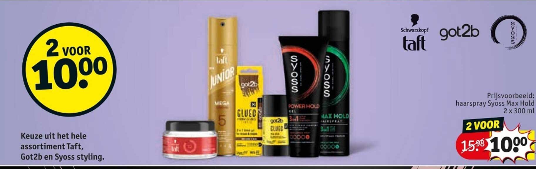 Ben je op zoek naar hoogwaardige haarstyling producten voor een geweldige prijs? Kijk dan snel hier! Bij Kruidvat krijg je nu de kans om te profiteren van een fantastische aanbieding: kies 2 producten uit het volledige assortiment van Taft, Got2b en Syoss styling voor slechts €10,00. Dit is de perfecte gelegenheid om verschillende producten uit te proberen en je haar de verzorging en stijl te geven die het verdient.