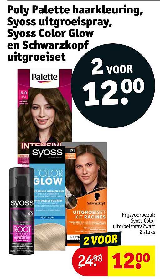 Heb je behoefte aan een frisse look of wil je jouw haarkleur bijwerken zonder de bank te breken? Dan is deze aanbieding echt iets voor jou! Bij Kruidvat krijg je nu de kans om Poly Palette haarkleur, Syoss uitgroeispray, Syoss Color Glow en het Schwarzkopf uitgroeiset aan te schaffen voor slechts 12 euro, als je er twee koopt. Dit is de perfecte gelegenheid om je haar weer stralend en vol leven te maken!