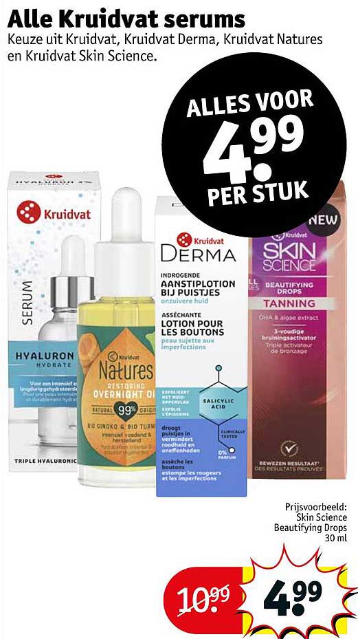 Bekijk de Alle Kruidvat Serums aanbieding bij Kruidvat! Deze fantastische aanbieding is nu beschikbaar in de nieuwste Kruidvat folder. Profiteer van deze kans en bespaar flink op je aankoop.
