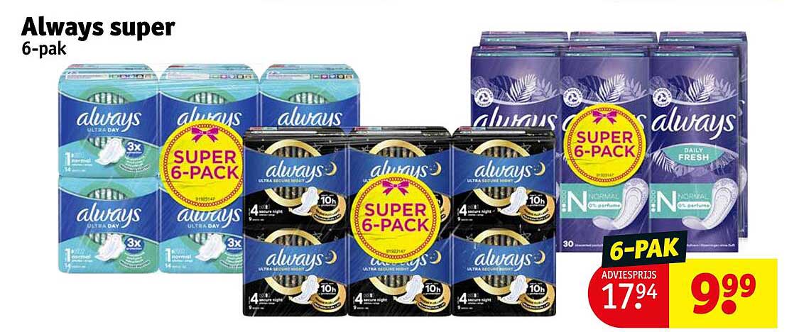 Bekijk de Always Super 6-Pak aanbieding bij Kruidvat! Deze fantastische aanbieding is nu beschikbaar in de nieuwste Kruidvat folder. Profiteer van deze kans en bespaar flink op je aankoop.
