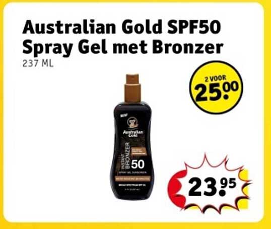 Bekijk nu de Australian Gold SPF50 Spray Gel met Bronzer aanbieding in de Kruidvat folder. Deze aanbieding is geldig van 12-06-2025 tot en met 17-08-2025.