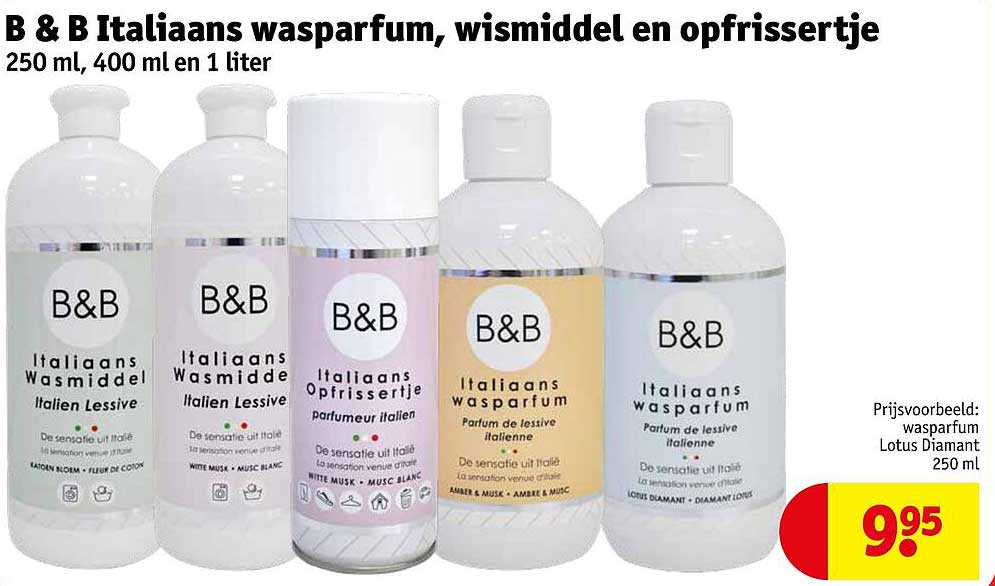 Bekijk de B & B Italiaans Wasparfum, Wasmiddel En Opfrissertje aanbieding bij Kruidvat! Deze fantastische aanbieding is nu beschikbaar in de nieuwste Kruidvat folder. Profiteer van deze kans en bespaar flink op je aankoop.