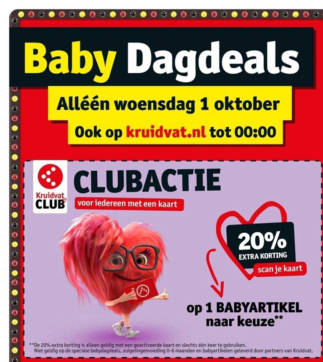 Heb je kinderen of ben je van plan om de komst van een kleintje te vieren? Dan hebben we goed nieuws voor jou! Op woensdag 1 oktober kun je profiteren van de geweldige Baby Dagdeals bij Kruidvat. Deze actie biedt je de kans om extra te besparen op babyproducten waar je dol op bent. Vergeet niet je Kruidvat Clubkaart mee te nemen, want dan krijg je maar liefst 20% extra korting op één babyartikel naar keuze. Een unieke kans om je favoriete producten aan te schaffen tegen een gereduceerde prijs!