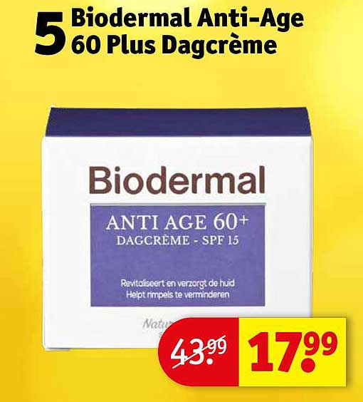 Bekijk de Biodermal Anti-Age 60 Plus Dagcrème aanbieding bij Kruidvat! Deze fantastische aanbieding is nu beschikbaar in de nieuwste Kruidvat folder. Profiteer van deze kans en bespaar flink op je aankoop.
