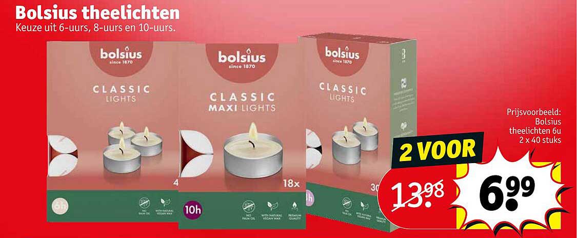 Ontdek de geweldige Bolsius Theelichten aanbieding in de nieuwste Kruidvat folder. Naast deze aanbieding vind je nog veel meer aantrekkelijke kortingen. Je kunt de Bolsius Theelichten eenvoudig online bestellen via de Kruidvat website of kopen in een winkel bij jou in de buurt.