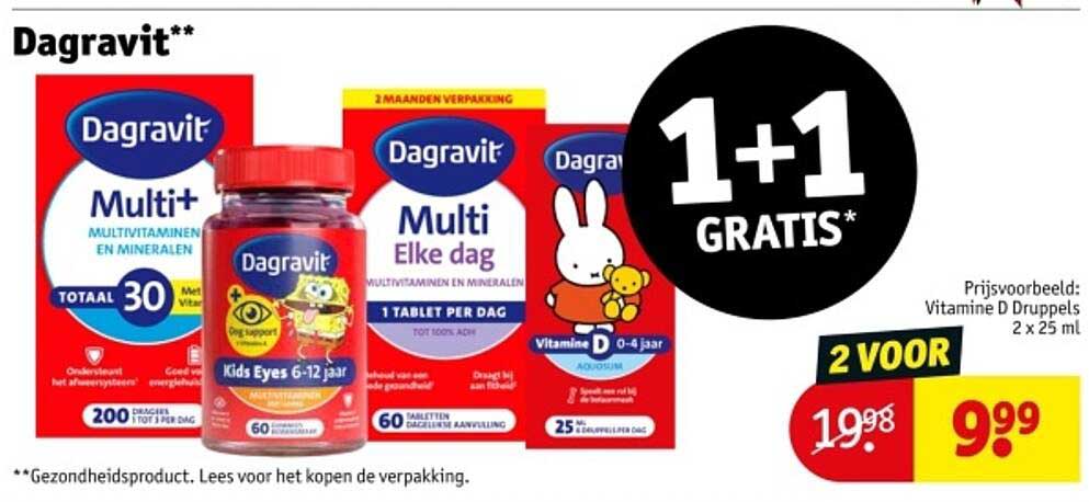 Deze aanbieding van Dagavit is perfect voor ouders die willen zorgen voor de gezondheid van hun kinderen. Met de 1+1 gratis actie krijg je twee pakketten voor de prijs van één. Dit is een geweldige kans om je kinderen de essentiële vitamines en mineralen te geven die ze nodig hebben voor een gezonde groei en ontwikkeling.