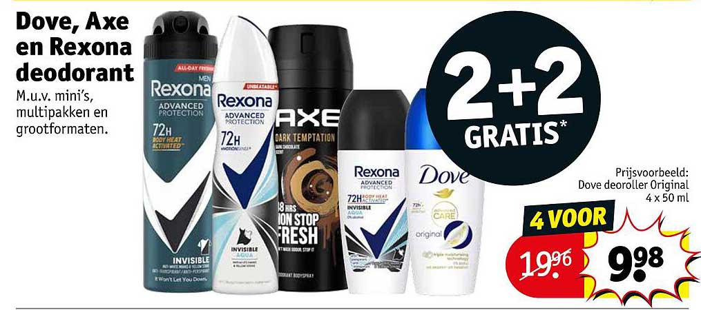 Bekijk de Dove, Axe En Rexona Deodorant aanbieding bij Kruidvat! Deze fantastische aanbieding is nu beschikbaar in de nieuwste Kruidvat folder. Profiteer van deze kans en bespaar flink op je aankoop.