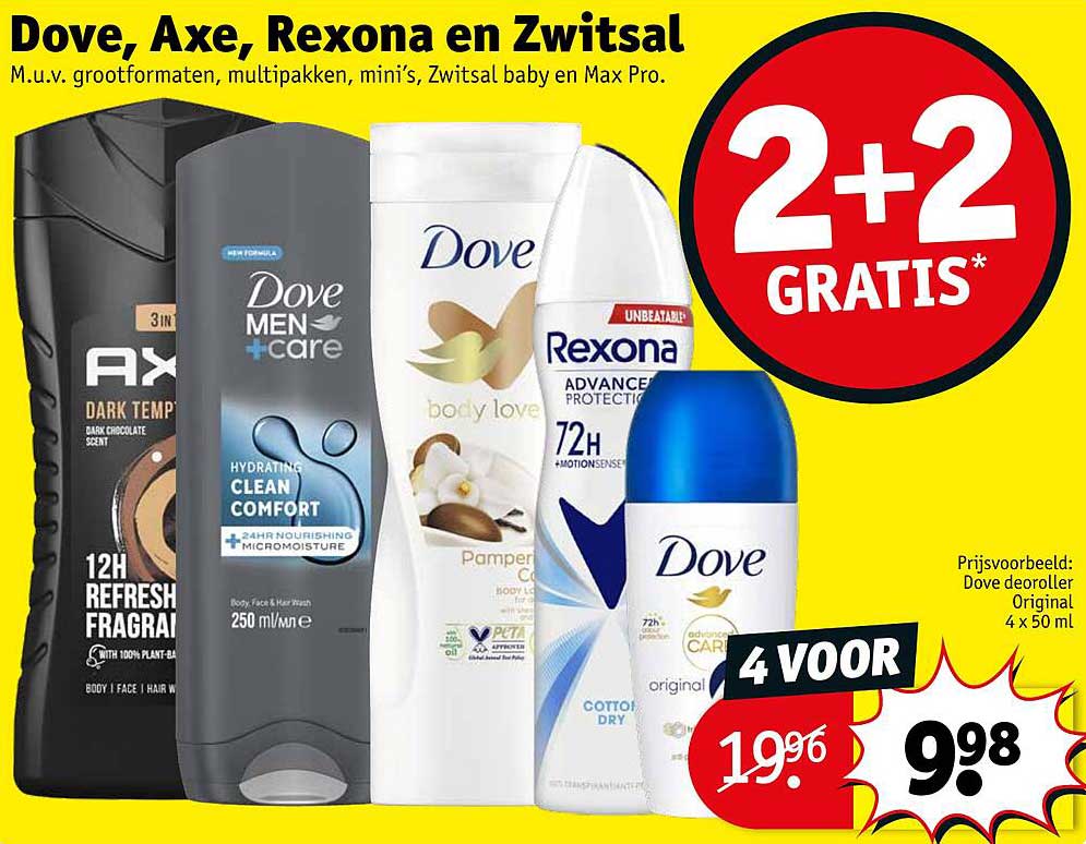 Dove, Axe, Rexona En Zwitsal 2+2 Gratis aanbieding bij Kruidvat