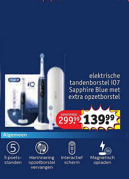 Ontdek de geweldige Elektrische Tandenborstel Io7 Sapphire Blue Met Extra Opzetborstel aanbieding in de nieuwste Kruidvat folder. Naast deze aanbieding vind je nog veel meer aantrekkelijke kortingen. Je kunt de Elektrische Tandenborstel Io7 Sapphire Blue Met Extra Opzetborstel eenvoudig online bestellen via de Kruidvat website of kopen in een winkel bij jou in de buurt.