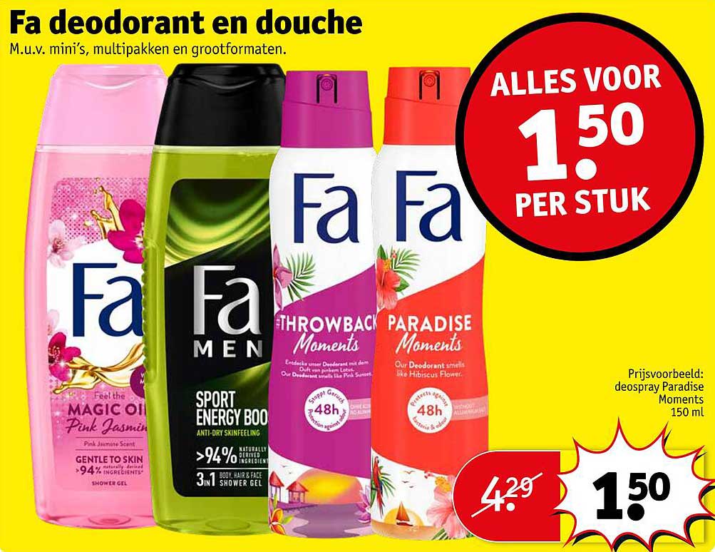 Ontdek de geweldige Fa Deodorant En Douche aanbieding in de nieuwste Kruidvat folder. Naast deze aanbieding vind je nog veel meer aantrekkelijke kortingen. Je kunt de Fa Deodorant En Douche eenvoudig online bestellen via de Kruidvat website of kopen in een winkel bij jou in de buurt.