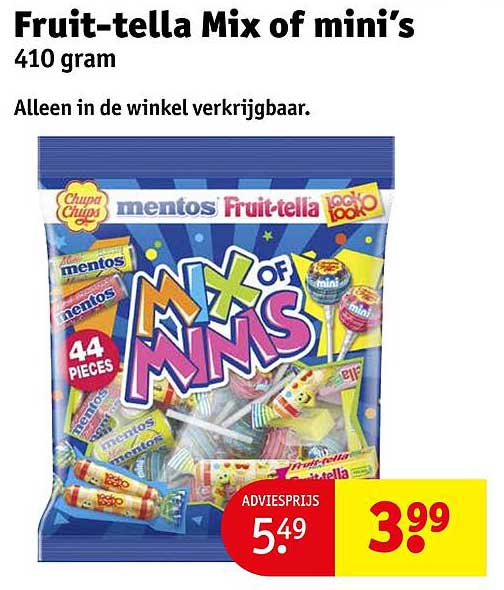 Bekijk de Fruit-Tella Mix Of Mini’s aanbieding bij Kruidvat! Deze fantastische aanbieding is nu beschikbaar in de nieuwste Kruidvat folder. Profiteer van deze kans en bespaar flink op je aankoop.