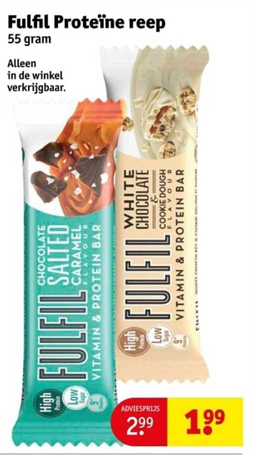 De reguliere adviesprijs voor de Fulfil Proteïne reep is €2,99, maar je kunt hem nu kopen voor slechts €1,99! Dit betekent een besparing van €1, dat is een geweldige kans om eens meer van deze heerlijke repen te proberen. Waarom zou je meer betalen als je nu kunt genieten van deze aanbieding?