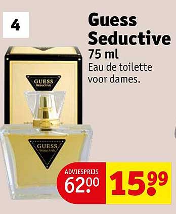 Ontdek de geweldige Guess Seductive aanbieding in de nieuwste Kruidvat folder. Naast deze aanbieding vind je nog veel meer aantrekkelijke kortingen. Je kunt de Guess Seductive eenvoudig online bestellen via de Kruidvat website of kopen in een winkel bij jou in de buurt.