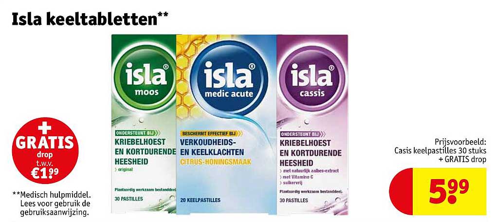 Bekijk de Isla Keeltabletten aanbieding bij Kruidvat! Deze fantastische aanbieding is nu beschikbaar in de nieuwste Kruidvat folder. Profiteer van deze kans en bespaar flink op je aankoop.