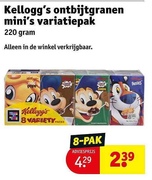 Bekijk de Kellogg’s Ontbijtgranen Mini’s Variatiepak aanbieding bij Kruidvat! Deze fantastische aanbieding is nu beschikbaar in de nieuwste Kruidvat folder. Profiteer van deze kans en bespaar flink op je aankoop.