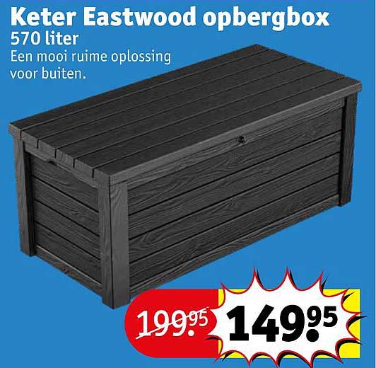 Bekijk de Keter Eastwood Opbergbox aanbieding bij Kruidvat! Deze fantastische aanbieding is nu beschikbaar in de nieuwste Kruidvat folder. Profiteer van deze kans en bespaar flink op je aankoop.