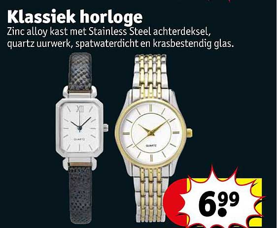 Bekijk de Klassiek Horloge aanbieding bij Kruidvat! Deze fantastische aanbieding is nu beschikbaar in de nieuwste Kruidvat folder. Profiteer van deze kans en bespaar flink op je aankoop.