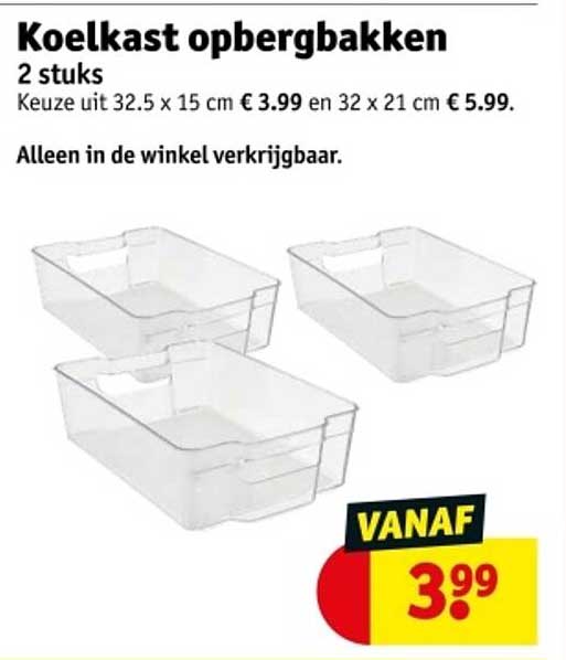 De aanbieding omvat 2 stuks koelkast opbergbakken, beschikbaar in twee maten: 32.5 x 15 cm en 32 x 21 cm. De bakken zijn gemaakt van duurzaam plastic en zijn eenvoudig schoon te maken. Met een prijs van slechts €3.99 voor de kleinere maat en €5.99 voor de grotere maat, krijg je waar voor je geld.