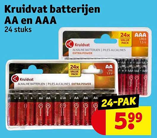 Bekijk nu de Kruidvat batterijen AA en AAA aanbieding in de Kruidvat folder. Deze aanbieding is geldig van 19-08-2024 tot en met 25-08-2024.