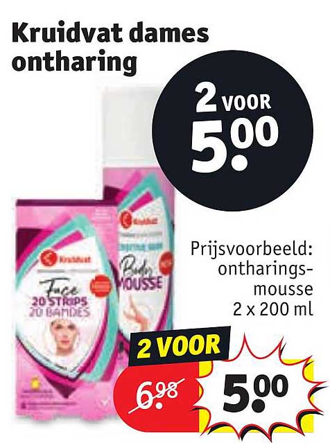 In deze aanbieding vind je onder andere de Kruidvat ontharingsmousse en 20 ontharingsstrips. De mousse is eenvoudig aan te brengen en zorgt ervoor dat je in een handomdraai van ongewenste haartjes af bent. De ontharingsstrips zijn ideaal voor een snelle en schone ontharing, met als resultaat een zijdezachte huid.