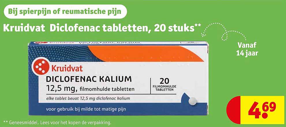 Ontdek de geweldige Kruidvat Diclofenac Tabletten, 20 Stuks aanbieding in de nieuwste Kruidvat folder. Naast deze aanbieding vind je nog veel meer aantrekkelijke kortingen. Je kunt de Kruidvat Diclofenac Tabletten, 20 Stuks eenvoudig online bestellen via de Kruidvat website of kopen in een winkel bij jou in de buurt.