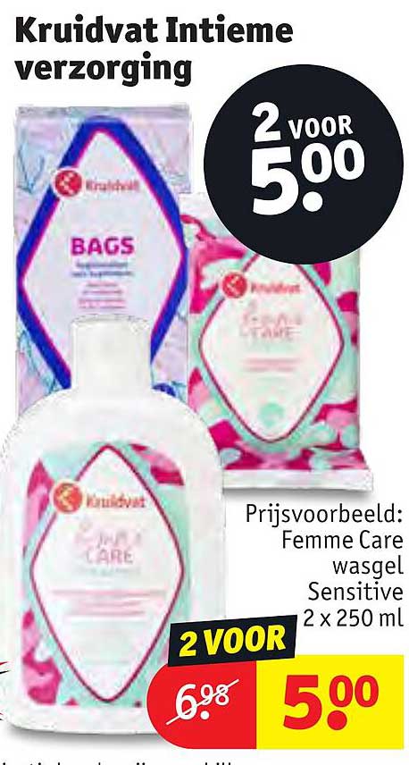 Ontdek de geweldige Kruidvat Intieme Verzorging aanbieding in de nieuwste Kruidvat folder. Naast deze aanbieding vind je nog veel meer aantrekkelijke kortingen. Je kunt de Kruidvat Intieme Verzorging eenvoudig online bestellen via de Kruidvat website of kopen in een winkel bij jou in de buurt.