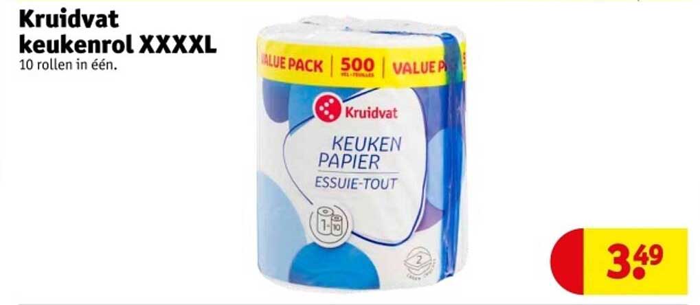 Maak kennis met de Kruidvat keukenrol XXXXXL! Deze super handige keukenrol bevat 10 rollen in één verpakking, perfect voor het gemak in jouw keuken. Of je nu aan het koken bent, de tafel aan het dekken is of een knoeipartijtje op te ruimen, met deze keukenrol ben je altijd voorbereid. De aanbieding is geldig van 2025-11-18 tot en met 2025-11-23, dus mis het niet!