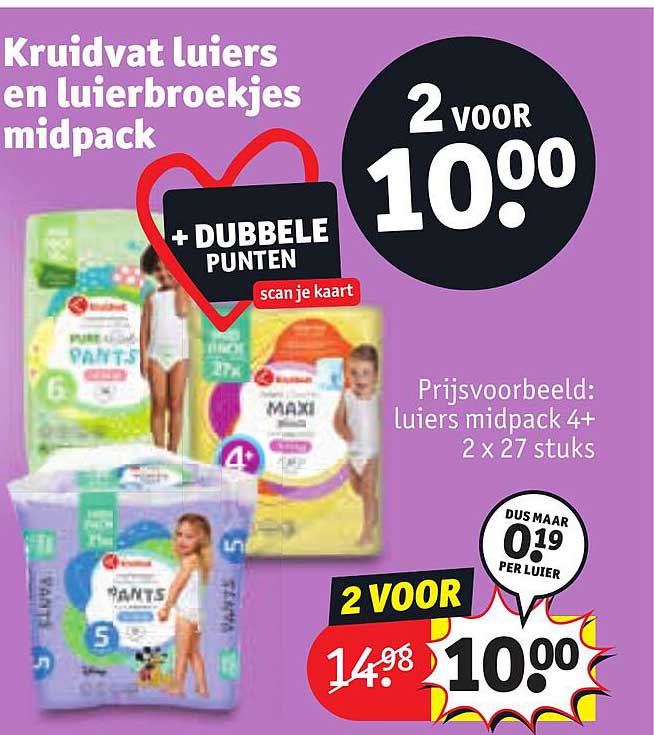 Bekijk de Kruidvat Luiers En Luierbroekjes Midpack aanbieding bij Kruidvat! Deze fantastische aanbieding is nu beschikbaar in de nieuwste Kruidvat folder. Profiteer van deze kans en bespaar flink op je aankoop.