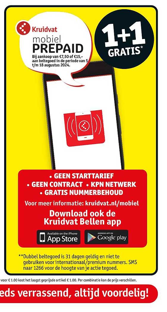 Ontdek de geweldige Kruidvat Mobiel Prepaid 1+1 Gratis* aanbieding in de nieuwste Kruidvat folder. Naast deze aanbieding vind je nog veel meer aantrekkelijke kortingen. Je kunt de Kruidvat Mobiel Prepaid 1+1 Gratis* eenvoudig online bestellen via de Kruidvat website of kopen in een winkel bij jou in de buurt.