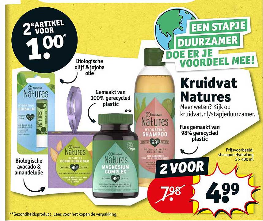 Ontdek de geweldige Kruidvat Natures aanbieding in de nieuwste Kruidvat folder. Naast deze aanbieding vind je nog veel meer aantrekkelijke kortingen. Je kunt de Kruidvat Natures eenvoudig online bestellen via de Kruidvat website of kopen in een winkel bij jou in de buurt.