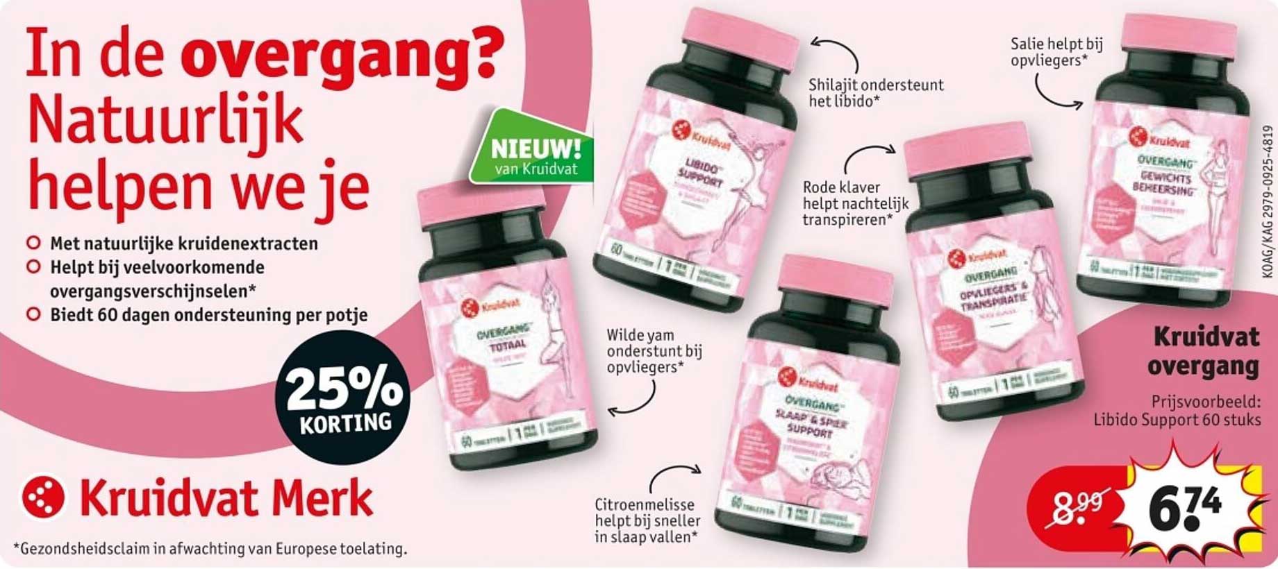 Heb je in de overgang en zoek je naar manieren om deze fase van je leven zo comfortabel mogelijk te maken? Op deze pagina vind je een fantastische aanbieding van Kruidvat die speciaal is ontwikkeld om jou te ondersteunen. Met natuurlijke kruidenextracten biedt dit product hulp bij veelvoorkomende overgangsverschijnselen, zodat je weer kunt genieten van elke dag zonder gedoe.
