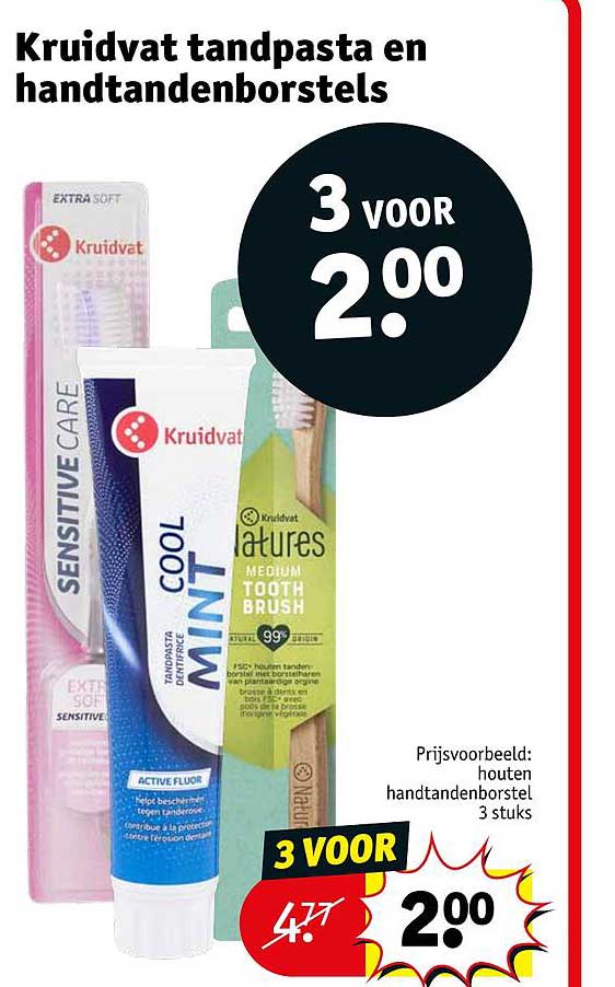 Wil je direct op de hoogte zijn zodra de Kruidvat Tandpasta En Handtandenborstels in de aanbieding is? Meld je aan voor onze aanbiedingen-alert. Zo krijg je een melding zodra het product tegen een voordelige prijs beschikbaar is.