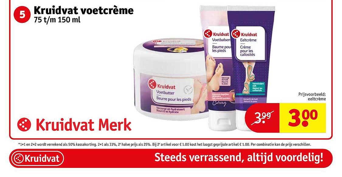 Ontdek de geweldige Kruidvat Voetcrème aanbieding in de nieuwste Kruidvat folder. Naast deze aanbieding vind je nog veel meer aantrekkelijke kortingen. Je kunt de Kruidvat Voetcrème eenvoudig online bestellen via de Kruidvat website of kopen in een winkel bij jou in de buurt.