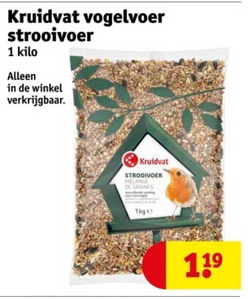Bekijk nu de Kruidvat vogelvoer strooivoer 1 kilo aanbieding in de Kruidvat folder. Deze aanbieding is geldig van 18-11-2025 tot en met 23-11-2025.