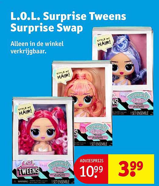 Ontdek de geweldige L.o.l. Surprise Tweens Surprise Swap aanbieding in de nieuwste Kruidvat folder. Naast deze aanbieding vind je nog veel meer aantrekkelijke kortingen. Je kunt de L.o.l. Surprise Tweens Surprise Swap eenvoudig online bestellen via de Kruidvat website of kopen in een winkel bij jou in de buurt.