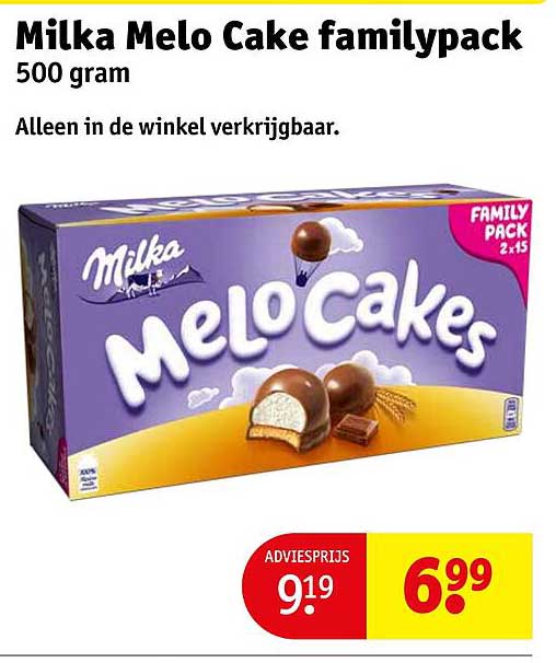 Wil je direct op de hoogte zijn zodra de Milka Melo Cake Familypack in de aanbieding is? Meld je aan voor onze aanbiedingen-alert. Zo krijg je een melding zodra het product tegen een voordelige prijs beschikbaar is.