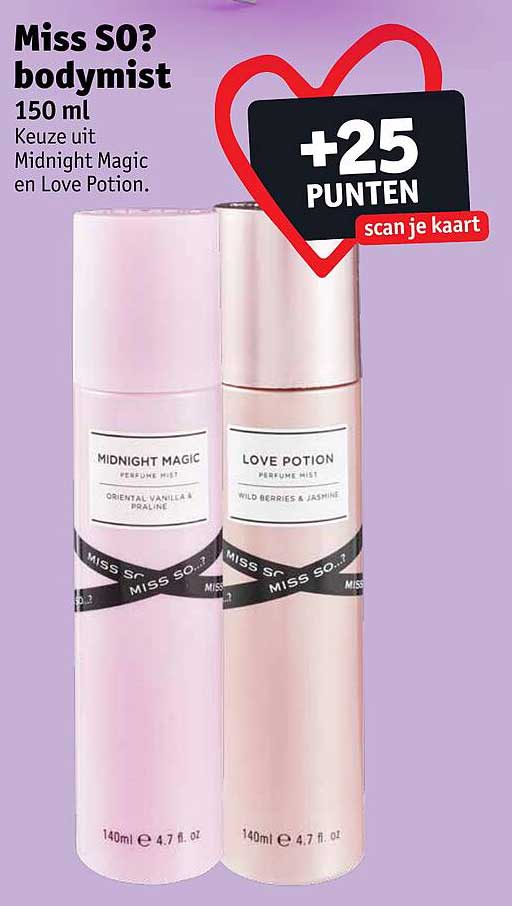 Bekijk nu de Miss SO? bodymist 150 ml - Keuze uit Midnight Magic en Love Potion. aanbieding in de Kruidvat folder. Deze aanbieding is geldig van 14-04-2025 tot en met 20-04-2025.